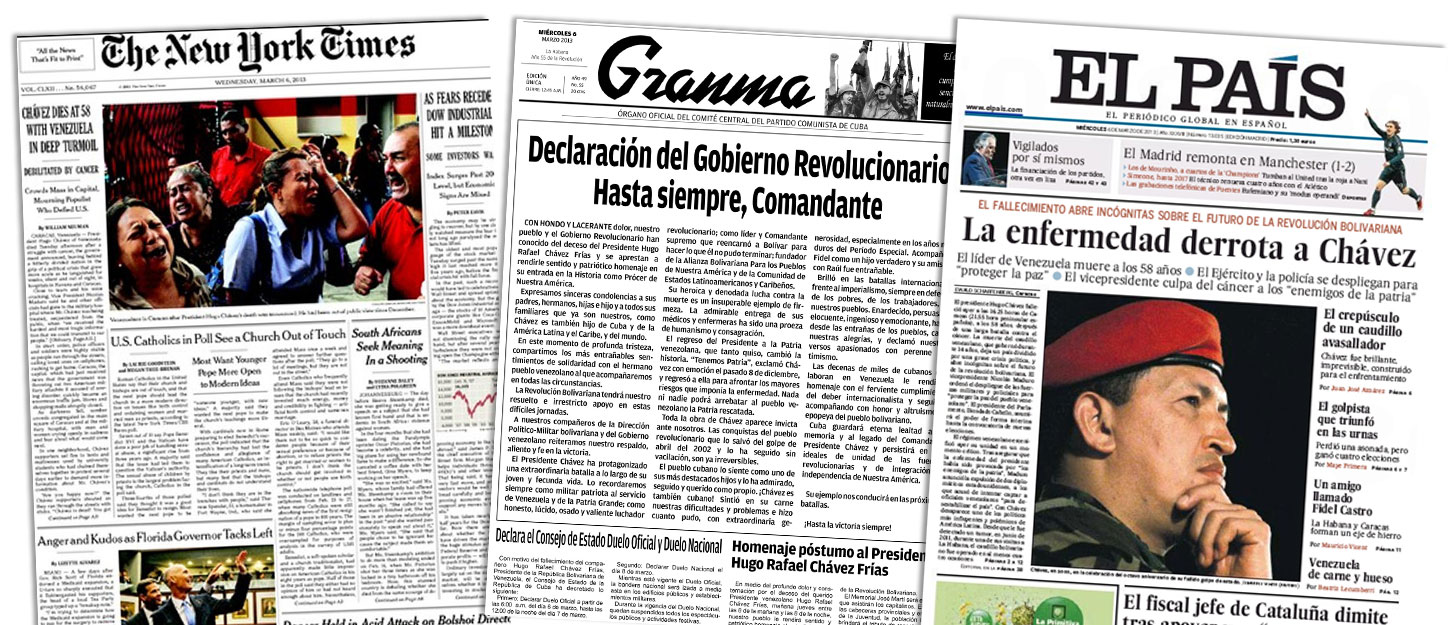 Portadas 1 Publicado 6 marzo, 2013 en 1454 × 625 en ¿La portada lo dice todo? Siguiente → The New York Times también dedica su primera plana a Chávez. Granma (Cub.) publica una carta de condolencia. El País (Esp.) habla de incertidumbre.