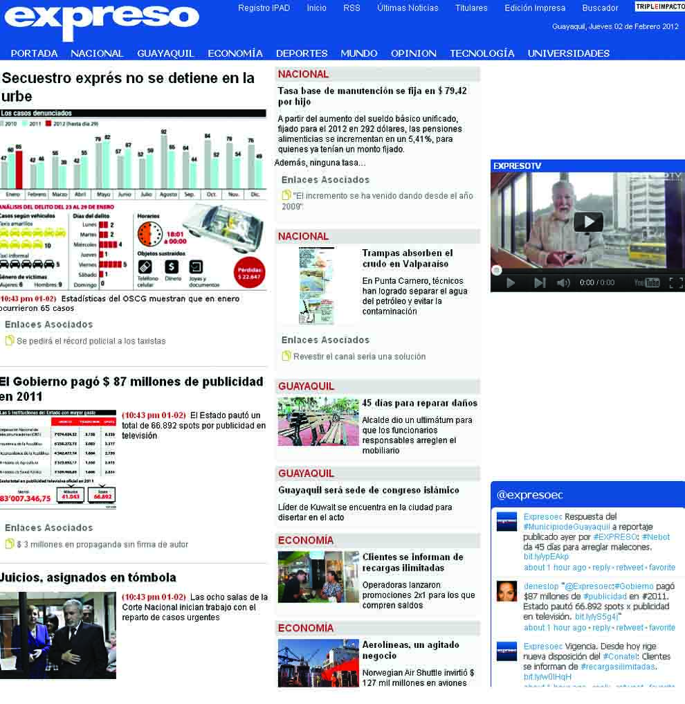Esta página de El Expreso es muy básica. Se actualiza muy poco, es más, este sitio es casi un registro de las notas que salen en la edición impresa. No tiene una conexión con Facebook, solo con Twitter. Cada publicación no tiene un espacio para los comentarios de los usuarios, algo fundamental dentro de un portal. El peso de esta página hace que la navegación sea lenta para los usuarios.